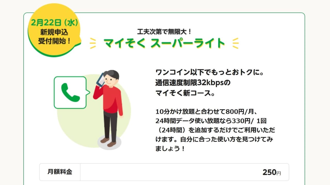 マイそく スーパーライトは2月22日に申し込み受付開始予定。通話メインのユーザーさんであれば10分かけ放題の550円込みでも月800円で運用できます。