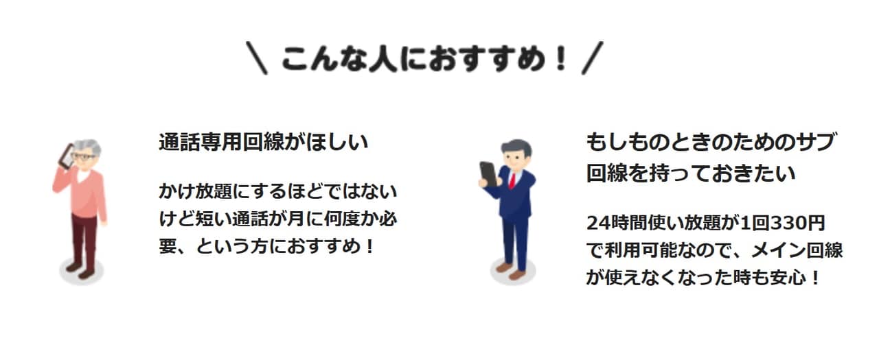 ▼もちろんデュアルSIMだけでなく、通話だけ行うシニアユーザーさんや、超格安で使えるSIMカードを1枚忍ばせておくというニーズにも良さげです。1日だけデータ通信が使えるようになるオプション「24時間使い放題(1回330円)」も活用可能。↓