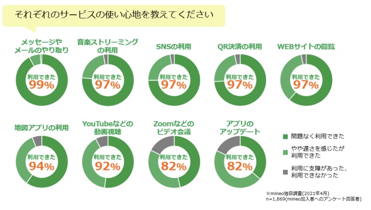 使い勝手ですが、メールとか音楽ストリーミング、SNSの利用など1度の通信で少量の通信が中心なら快適そう。一方で、YouTube、ZOOM、アプリアップデートなどデータ容量の多い使い方の場合満足度がやや下がってます。