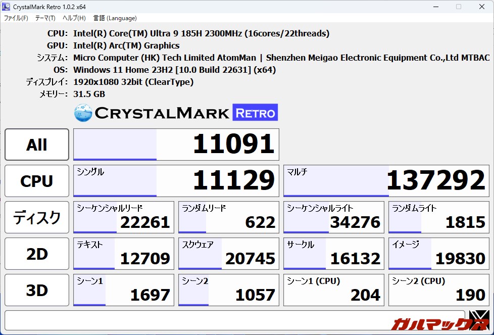 AtomMan X7 TiのCPUには執筆時点で最新のハイエンドモデルであるCore Ultra 9 185Hを搭載。普段使いでの動作は言うまでもなく快適です。ハイ。