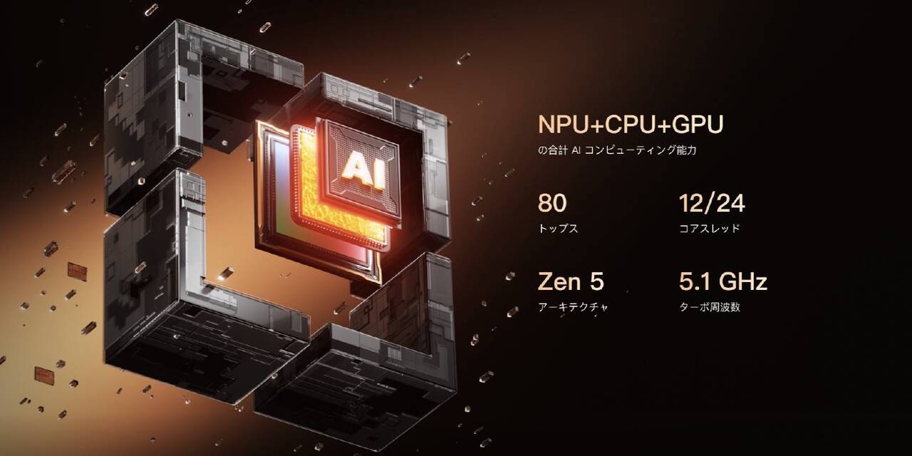 このプロセッサはAMD XDNA2 アーキテクチャを採用した世界最先端のニューラルプロセッシン グユニット(NPU)も備えていて50 AI TOPS の性能を発揮するとのこと。2倍の電力効率と5倍のAI性能を実現しているそうです。