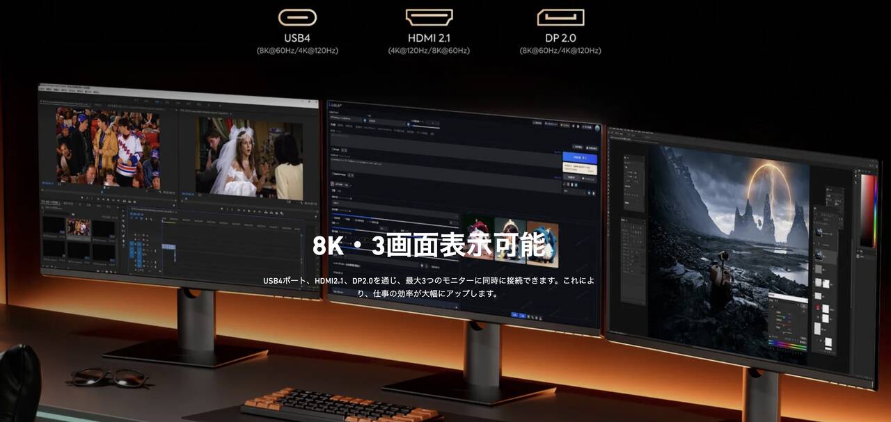 | インターフェース | USB Type A(USB3.2 Gen2) ×4 USB Type C(USB4) ×1 HDMI 2.1 ×1 DisplayPort 2.0 ×1 LAN端子(2.5Gbps) x 2 オーディオジャック ×1 DC端子 ×1 |