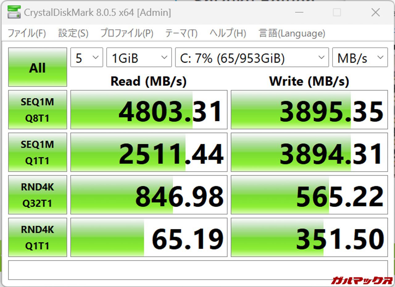 ▼ストレージ速度はPCIe 4.0接続のSSDとしてはミドルクラス。↓