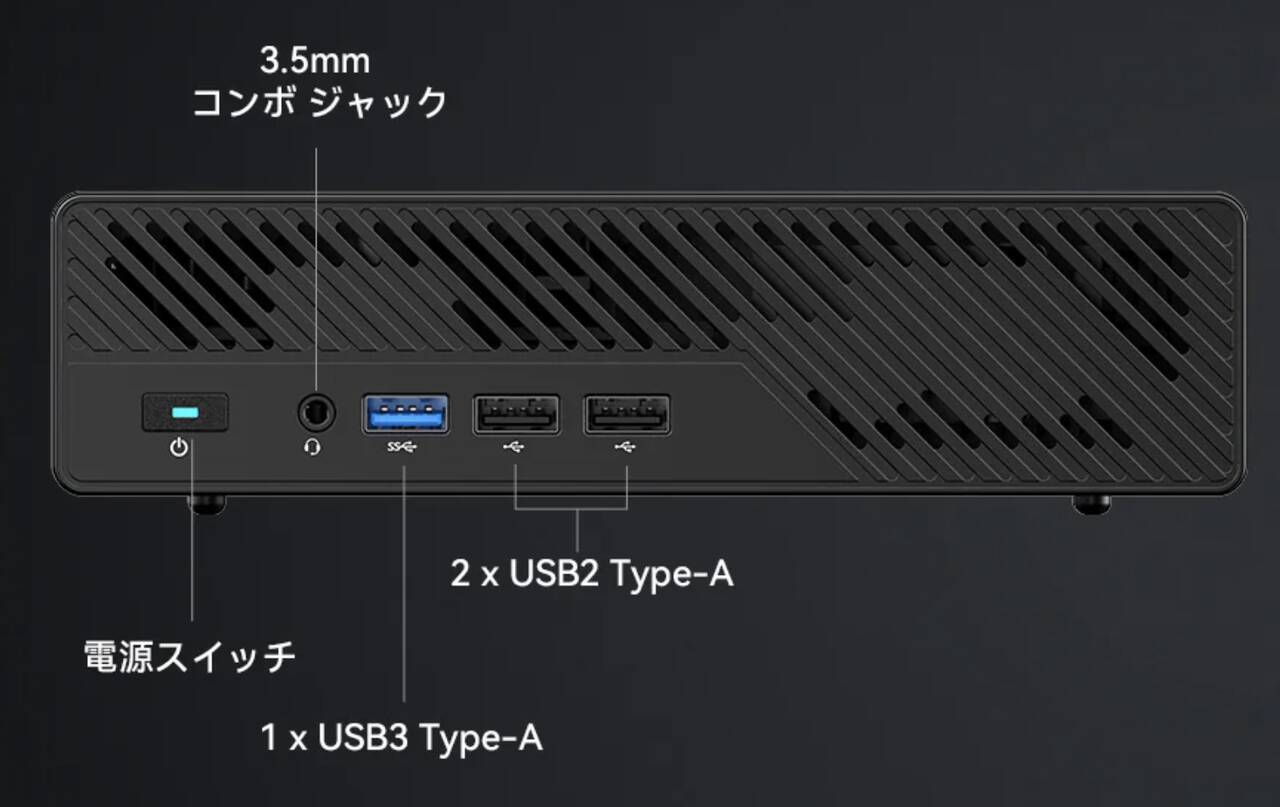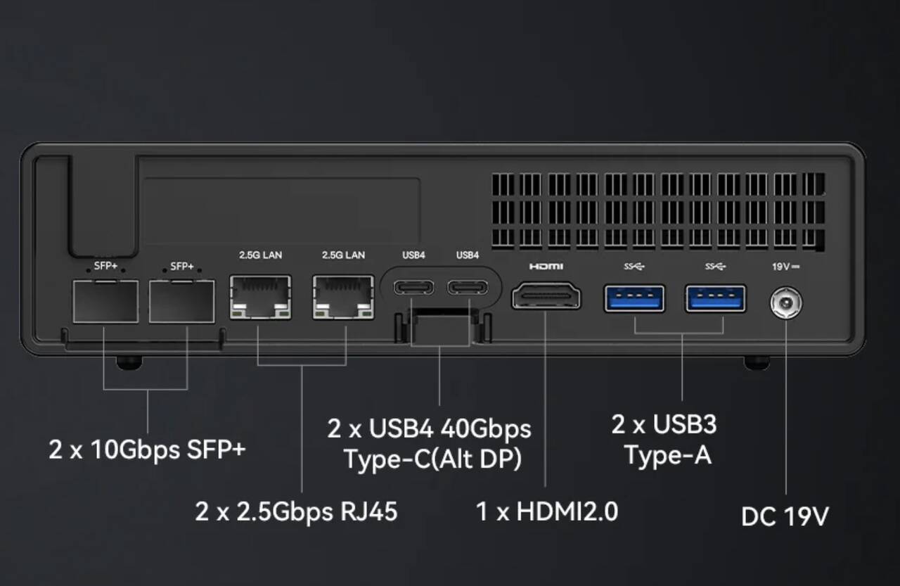 | インターフェース | 10G SFP+ ポート×2 RJ45 2.5G イーサネットポート×2 USB3.2 Gen2 Type-A ポート ×2 USB3.2 Gen1 Type-A ポート ×1 USB2.0 Type-A ポート ×2 USB4 ポート ×2(Alt DP) HDMI ×1 3.5mm コンボ ジャック×1 |