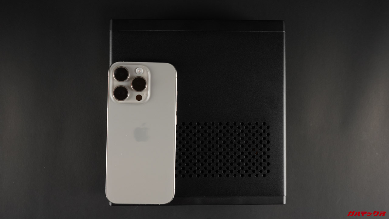 ▼iPhone 15 Proと比較するとこんな感じ!196×189×48mmあるので設置面積はそこそこ必要ですね〜。↓