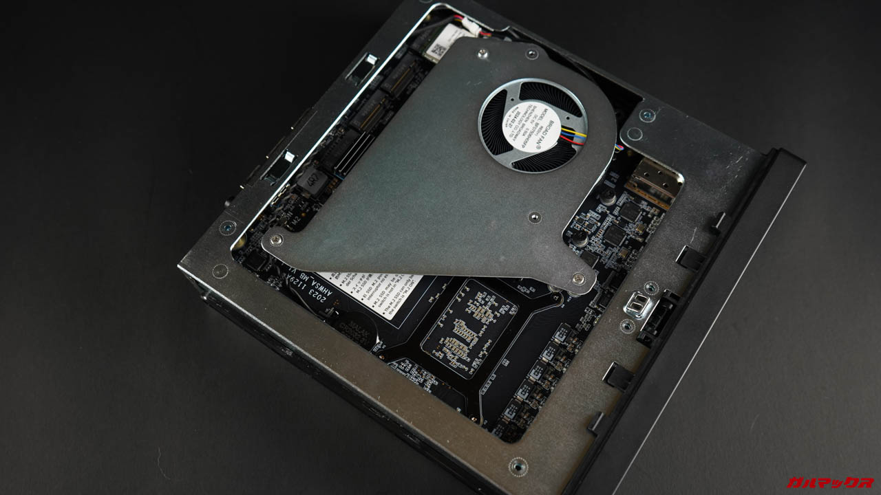 ワークステーションらしく内部へのアクセスが簡単だったのもGoodでした。シャコーンとレールに沿って中身が抜ける動作でハァハァできます。まあ完全ツールレスではないですが、普通のミニPCより随分とアクセスしやすいです。