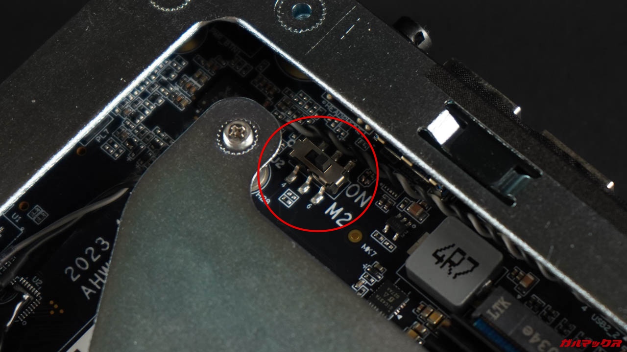 ▼U.2とM.2は基盤のスイッチで切り替えるようです。U.2とM.2は必要な電圧が違うので切り替え式になってると思うんですけど、電圧の高いU.2側でM.2を挿すとぶっ壊れる恐れがあるので注意しましょう。↓