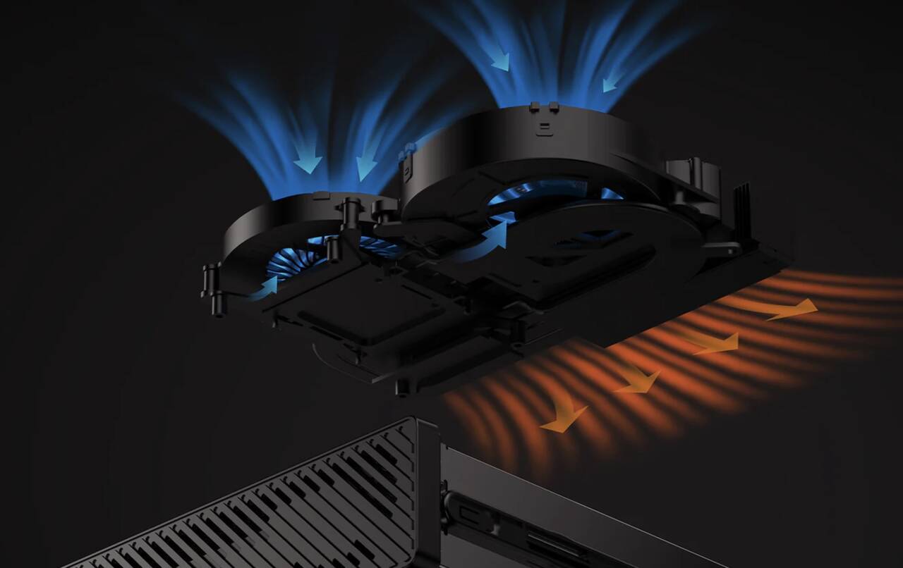 ▼大型の筐体にはデュアル冷却ファンも内蔵。冷却面もぬかりなし。↓