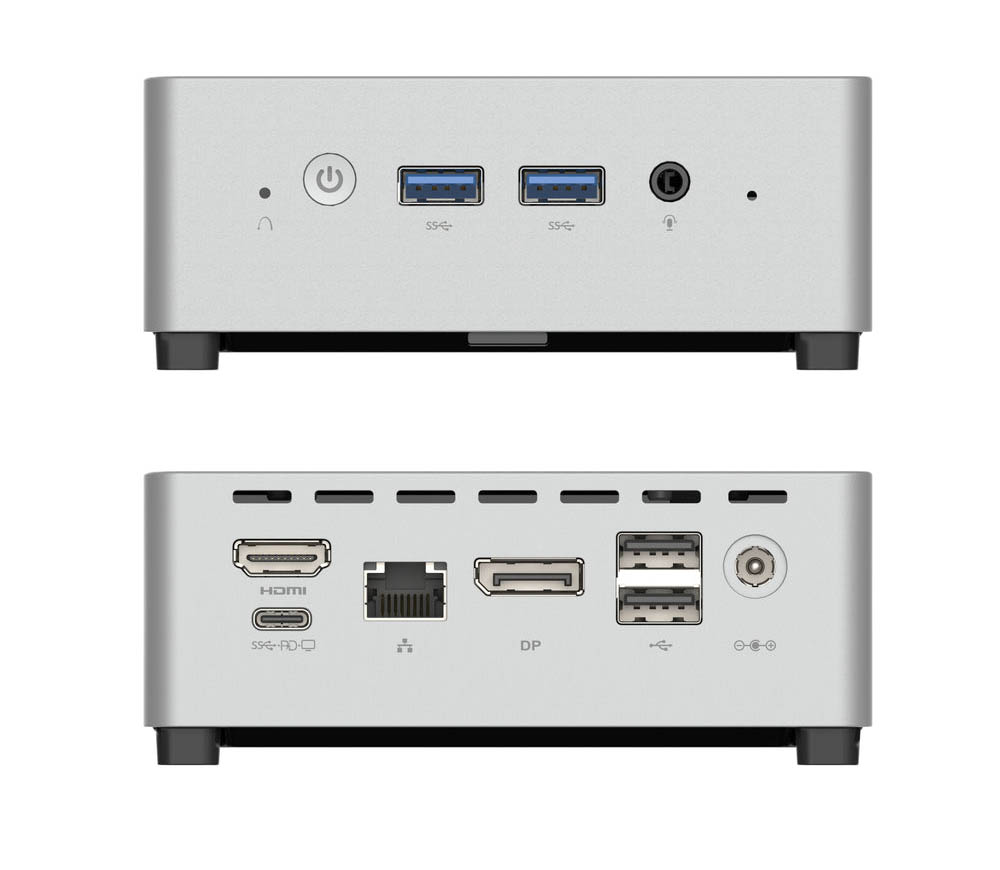 ▼前側面には電源ボタン、USB-Aが2つ、USB-Cが1つ、イヤホンジャックが1つ。左側面にはSDカードスロットが1つ。後側面にはUSB-Aが2つ、有線LANポートが1つ、HDMIが2つ、DCが1つ搭載されている。↓