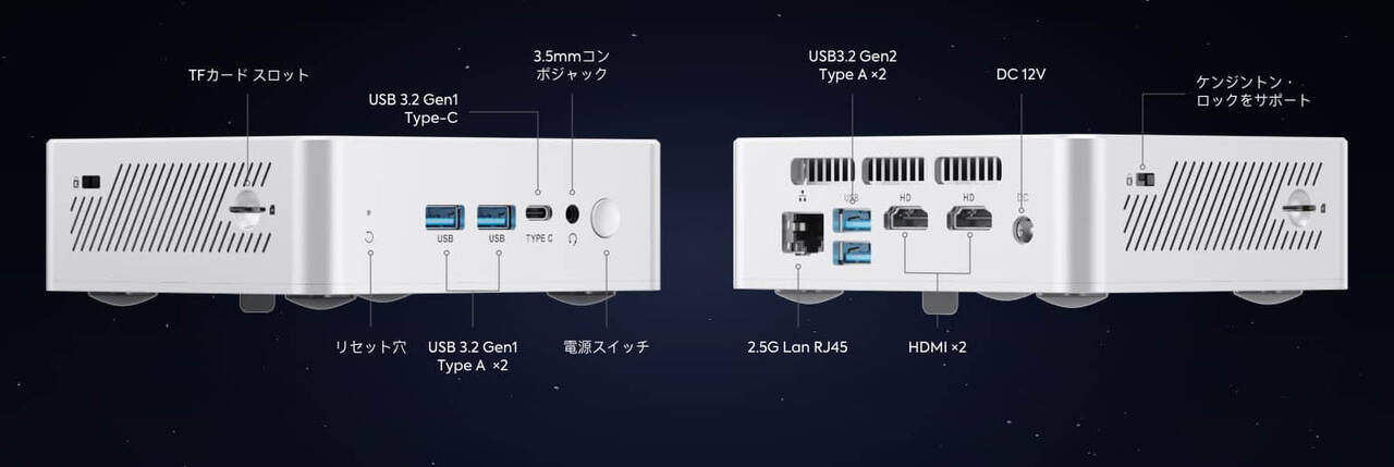 | インターフェース | 2× USB-A 3.2 Gen2 2× USB-A 3.2 Gen1 1× USB-C 3.2 Gen2 (DP、PD出力対応) 1× 3.5mmオーディオジャック 1× LAN (2.5Gbps) 2× HDMI 2.1 1× DC(12V) |