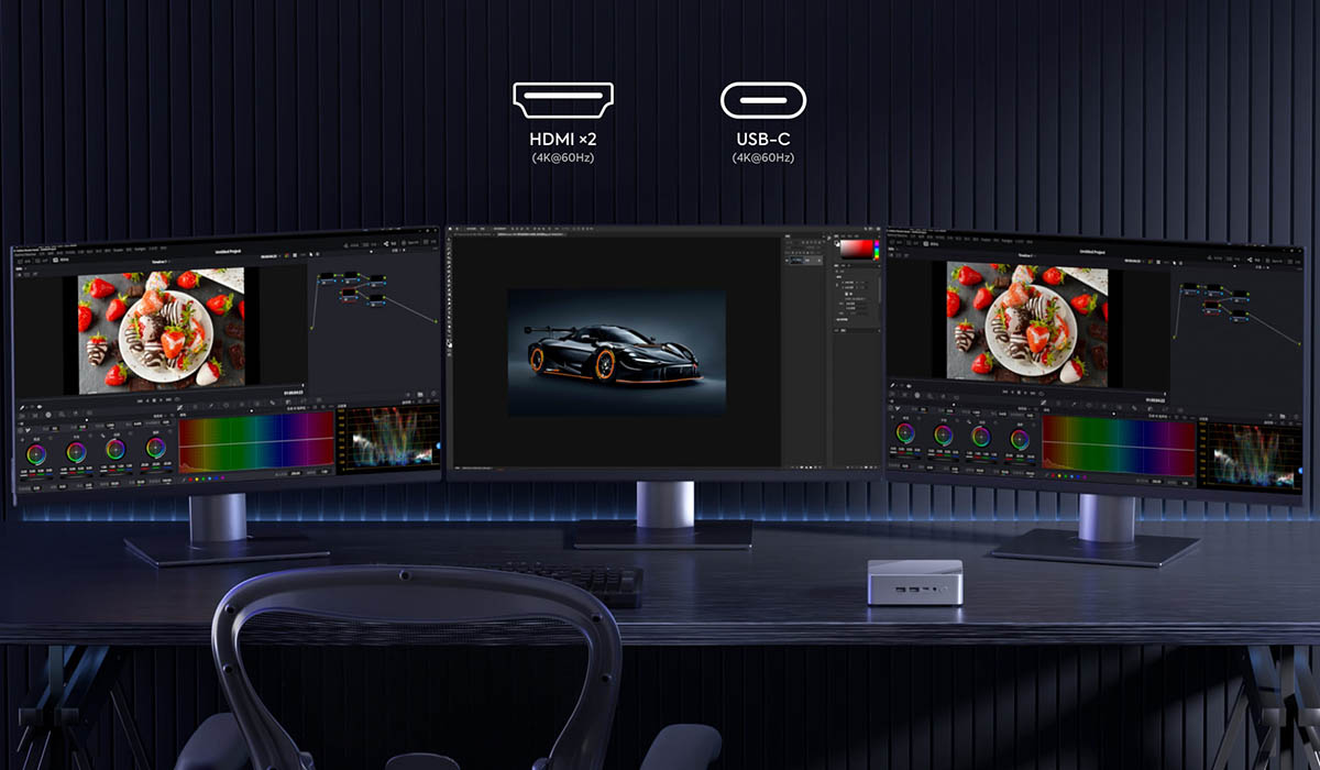 ▼本機はHDMI2つとUSB-C1つに接続することで最大3画面出力に対応しています。↓