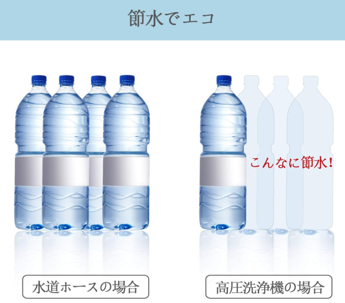 ▼高圧洗浄機は勢いよく水を飛ばすので、少量の水でも洗浄力は抜群。特に車の洗車時にホースを使って洗車していた方は大幅に利用する水を節水出来るのもGoodですね!↓