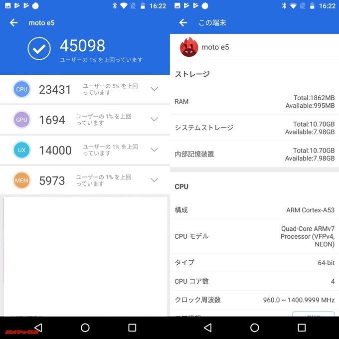 ▼moto e5の実機AnTuTuスコアは総合スコアが45098点、GPU(3D)スコアは1694点!↓