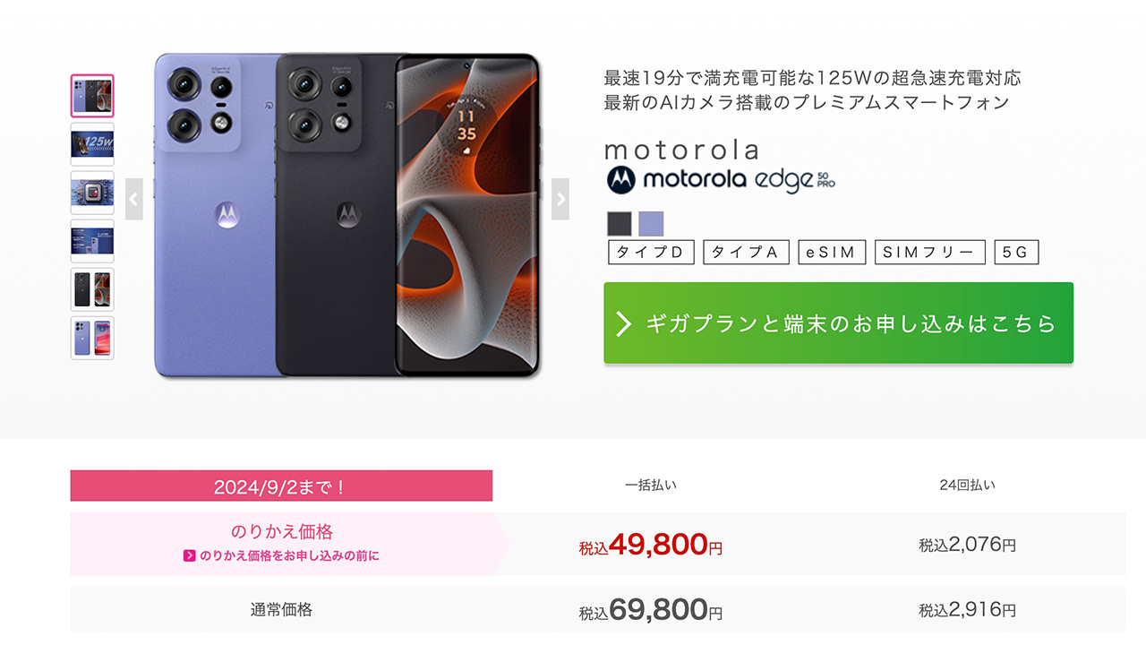 また、IIJmioへMNP(回線乗り換え)と同時にmoto edge 50 proを購入すると、なんと49,800円!普通に購入するよりも3万円も安く手に入っちゃうなんて、やっぱりMNP特典はまだまだ手厚いですね〜。