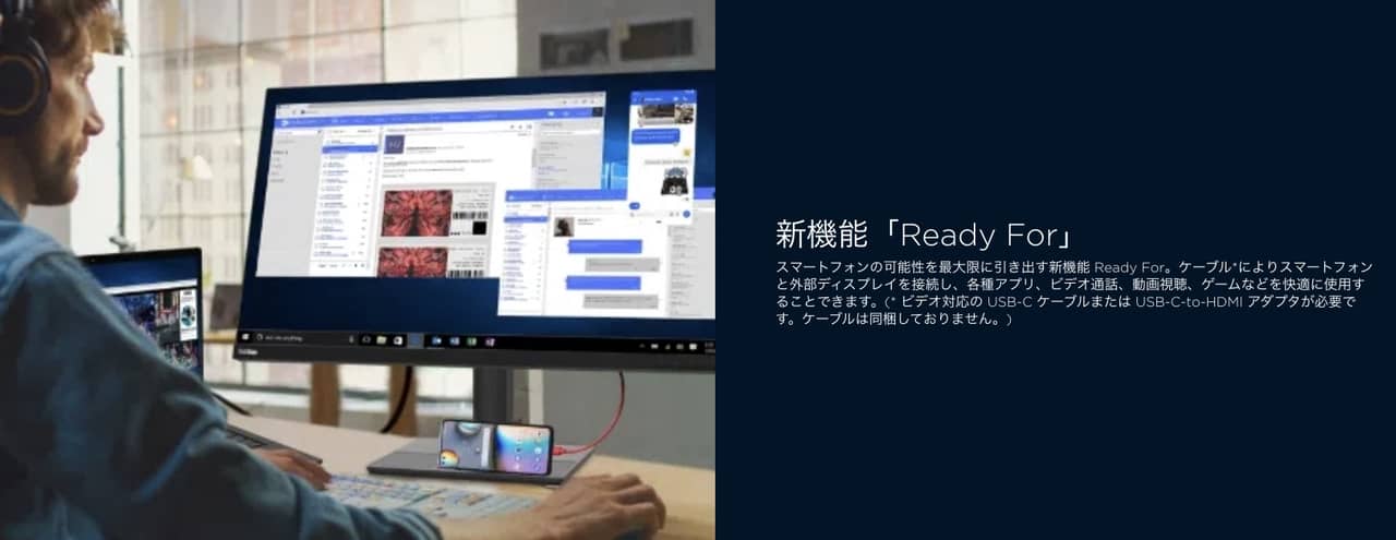 ▼moto g100はReady Forが使えるので大画面で動画を視聴したり、キーボードを使った長文のメール作成など作業も捗りそう!↓