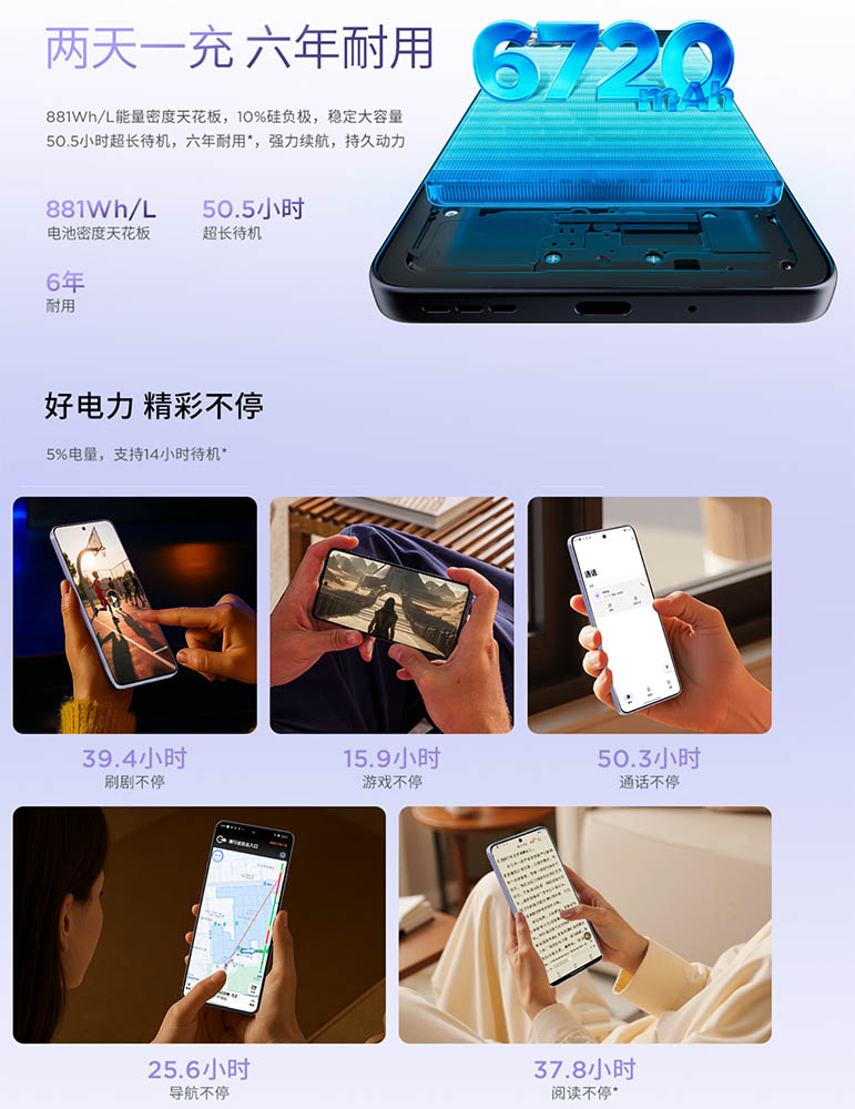 ▼バッテリー容量は6720mAh。39.4時間の連続ドラマ視聴が可能。バッテリー5%の状態で14時間のスタンバイが可能です。充電速度は30W。↓