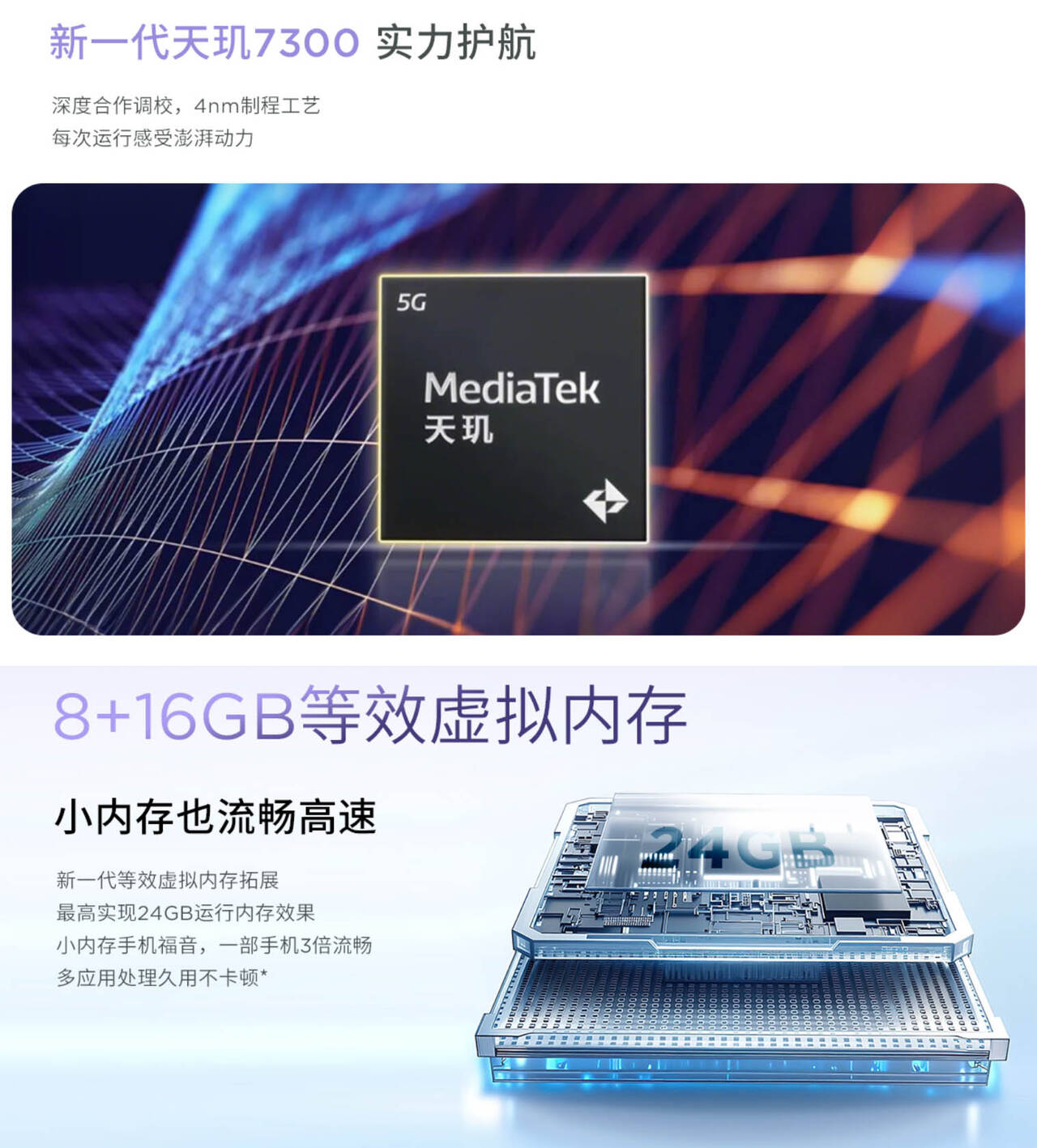 ▼SoCにはDimensity 7300を搭載。AnTuTuスコアは65万点ほどのSoCで、日常使いなら問題なく使える性能です。メモリ+ストレージは8GB+256GB、12GB+256GB、12GB+512GB。↓