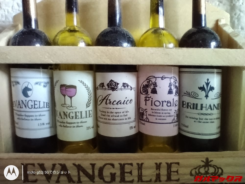 ▼写真は百均で買ったミニチュアのワインボトル(高さ3cm、ボトルの幅1cm)です。解像度が低すぎるせいで精細さは感じません。やべぇ、今までのスマホのマクロカメラで一番微妙かも。↓