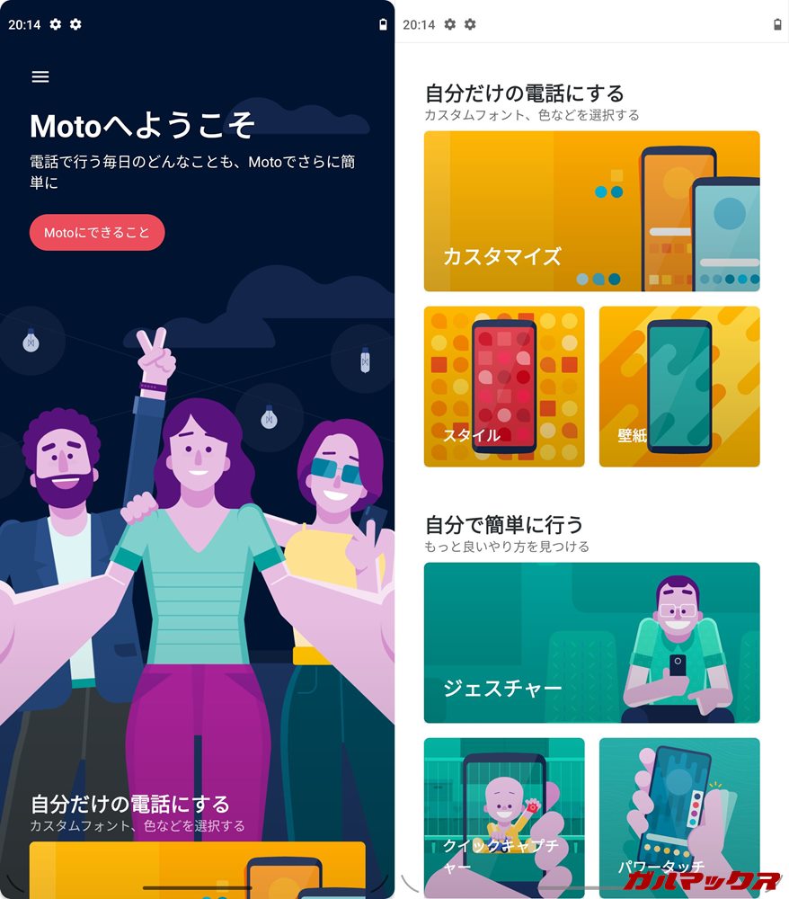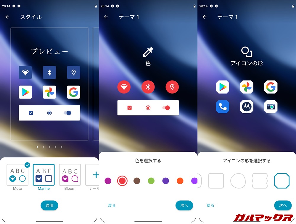 ▼さらに純正Android以上にカスタマイズもでき、アイコン形状、テーマカラーを細かく変えられるのもモトローラ独自の長所。好みに応じてスタイルを変えられるのは楽しいっすね(`・ω・´)。↓