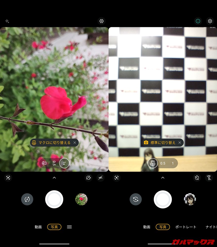▼インターフェースデザインはシンプル。ただ水平線表示ができたり、カメラから被写体の距離に応じてマクロ↔標準カメラの切り替え案内表示が出てくるのは親切でいいですね(`・ω・´)。↓