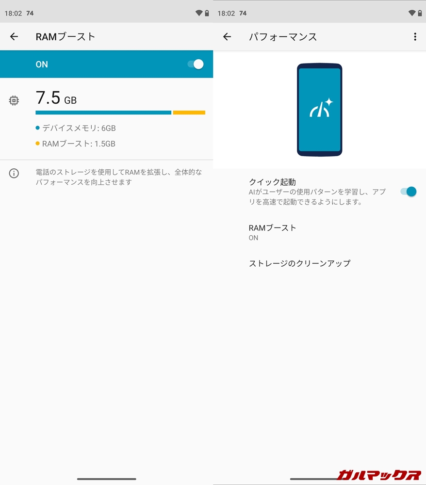 ▼また仮想RAM増設も対応しており、デフォルトで有効になっています。保存容量(ROM)は消費されるものの安定性がアップするので基本的にONがオススメですね。↓