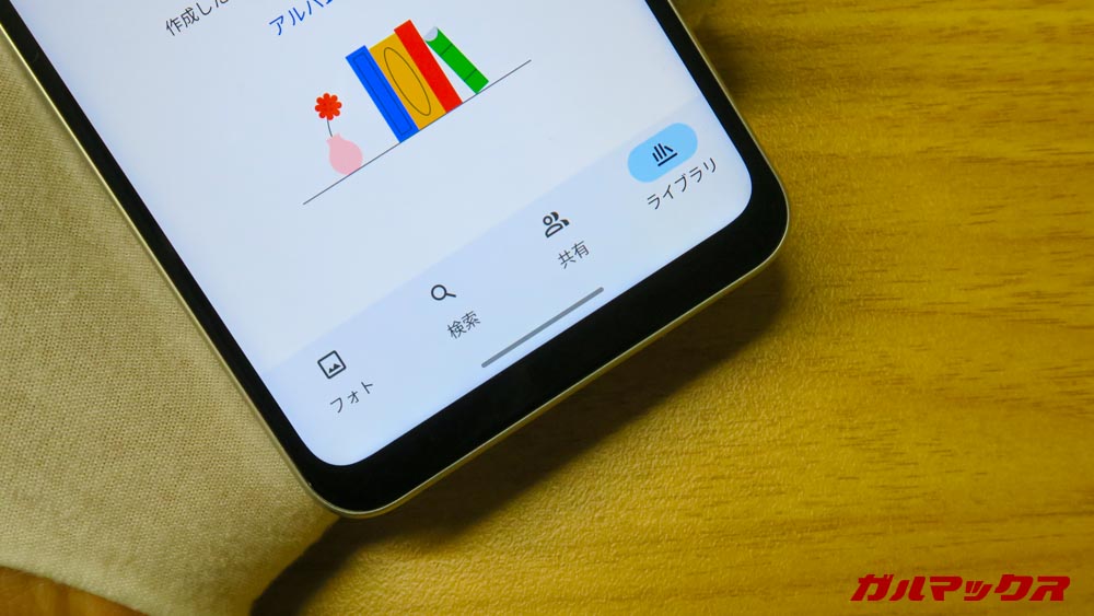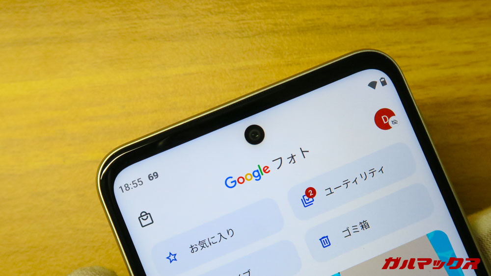 ▼一方でディスプレイ部分は野暮ったさを感じます。上下のベゼル幅はミドルレンジの上位モデルにしては厚め。パンチホール搭載モデルにしては幅が太く見えますね。↓