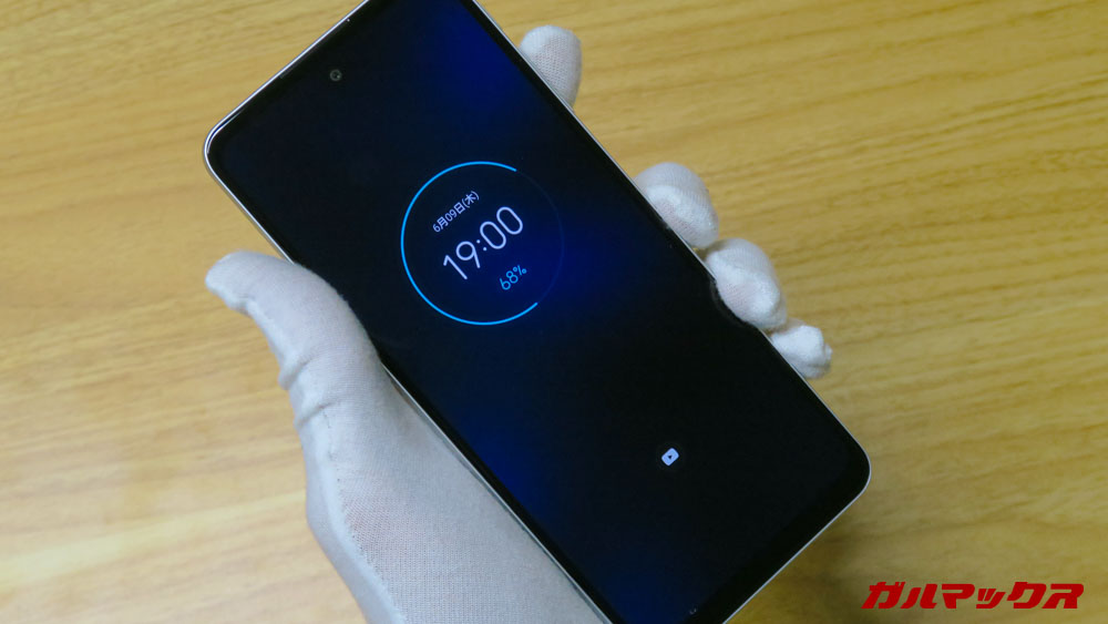 ▼有機ELスマホに見かけられるAoD表示は非対応ですが、端末を動かすと時計や通知などの情報を一定時間表示するピークディスプレイという独自機能が便利。この状態で上にスワイプするとロック解除もできます。↓