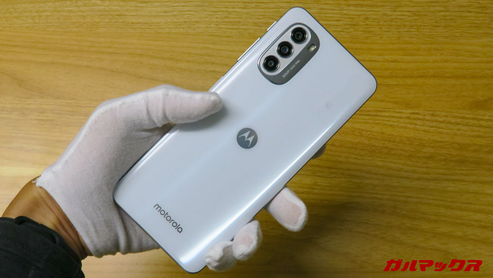 ▼moto g52j 5Gの背面パネル、サラッサラのマット加工がされているんですが、光り方がものすごくハイエンドチックで上質です!光の入り方も大変なめらかで、パールのような印象がすごくお気に入り。↓