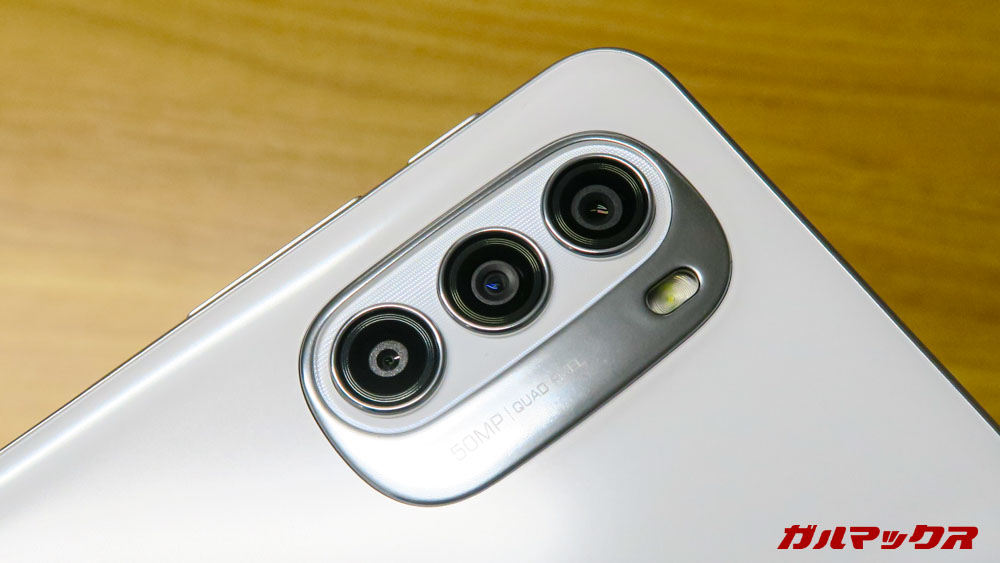 moto g52j 5Gのカメラは「5,000万画素のメインカメラ」+「800万画素の超広角カメラ」+「200万画素のマクロカメラ」という構成。この部分はよく見かけられる組み合わせですね。