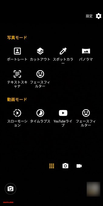 その他、パノラマ撮影の他、動画撮影モードではスローモーションやタイムラプス、面白いところだとYouTubeライブへ直接配信できるモード、写真モードでも搭載されているフェースフィルターが利用可能となってました。