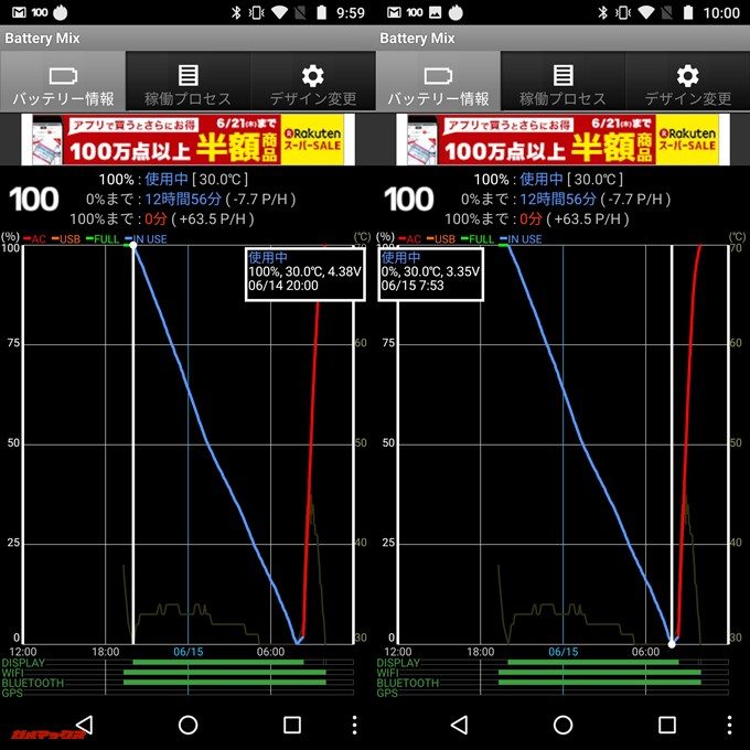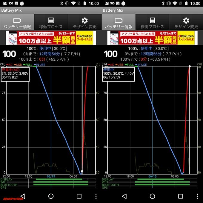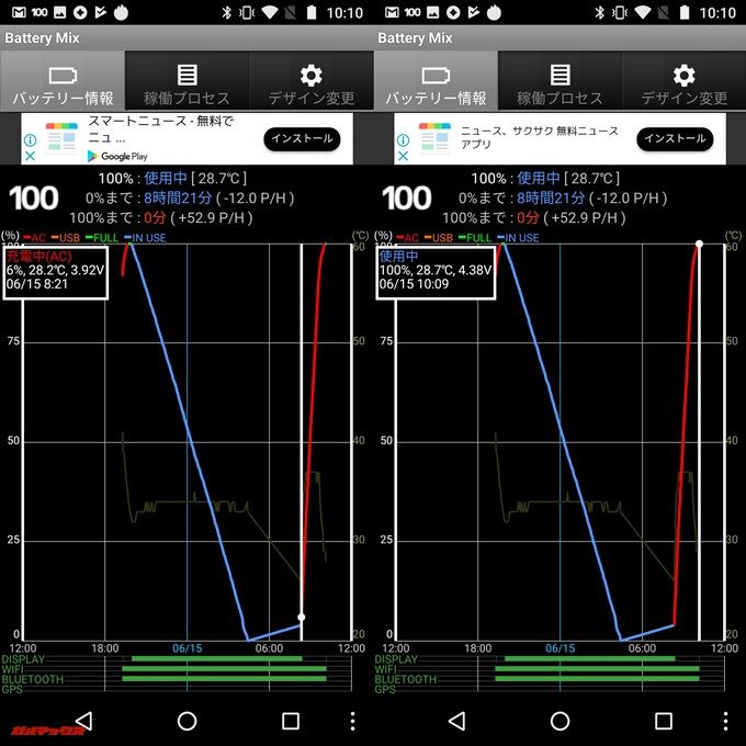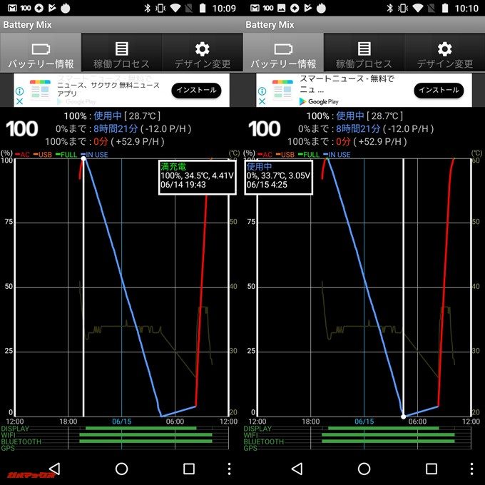 バッテリー残量を計測してグラフ化するアプリを利用しているので、バッテリー切れ直前にアプリが終了する場合があり数%の誤差が出る場合があるのでご了承下さい。