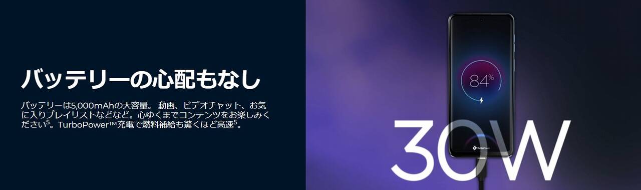 バッテリー容量は5,000mAhと大容量で、急速充電は30Wまで対応。ミドルレンジモデルとしては申し分ないスペックです。注意点として充電器の30W TurboPower チャージは別売りとなっています。
