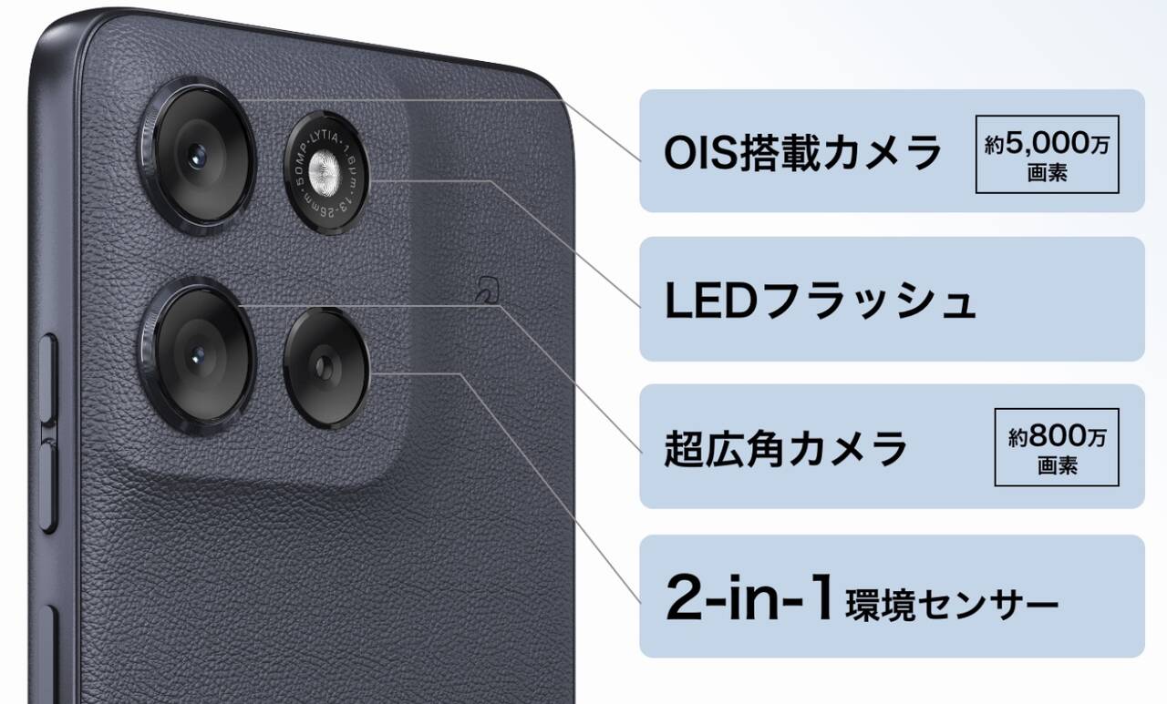 カメラはSony LYTIA 600センサーを採用する5,000万画素で光学手ブレ補正(OIS)対応の広角カメラ、広い範囲を撮影できる800万画素の超広角カメラのデュアルカメラ構成!周囲の環境を把握する環境センサーも備えているようですね〜。