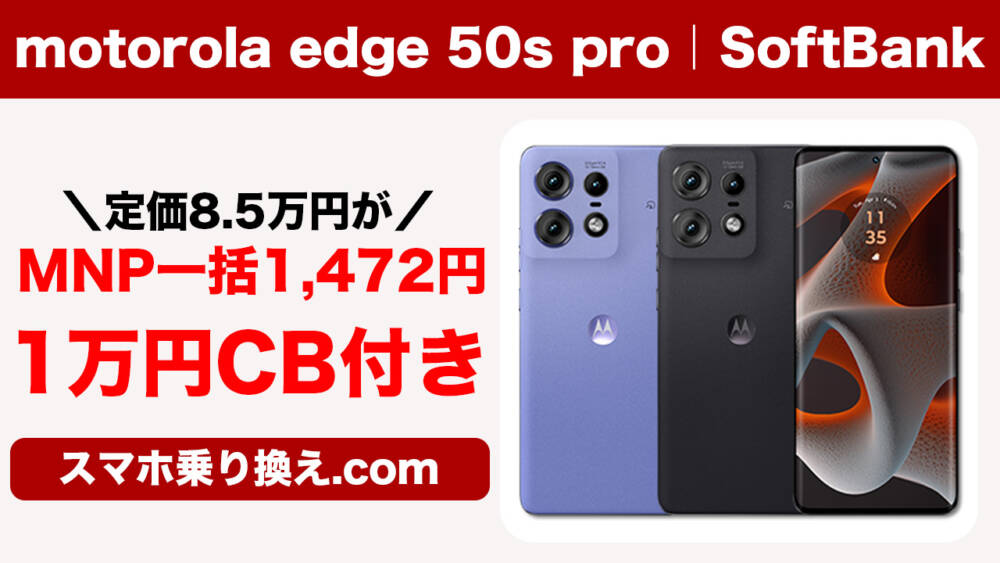 AnTuTuスコア80万点のミドルハイスマホ「motorola edge 50s pro」がソフバン系のWeb代理店のスマホ乗り換え.comで一括1,472円&5,000円キャッシュバックの大セール中。本家ソフトバンクオンラインショップで申し込むより安いです。過去最安値。