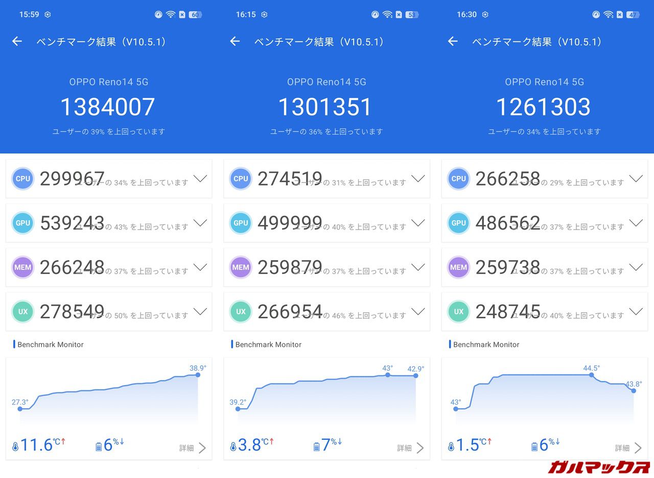 ▼MediaTek Dimensity 8350を搭載したOPPO Reno 14では大幅なパフォーマンス低下は見られなかったので、SoCの問題というよりかはシステムの最適化不足かなと。↓