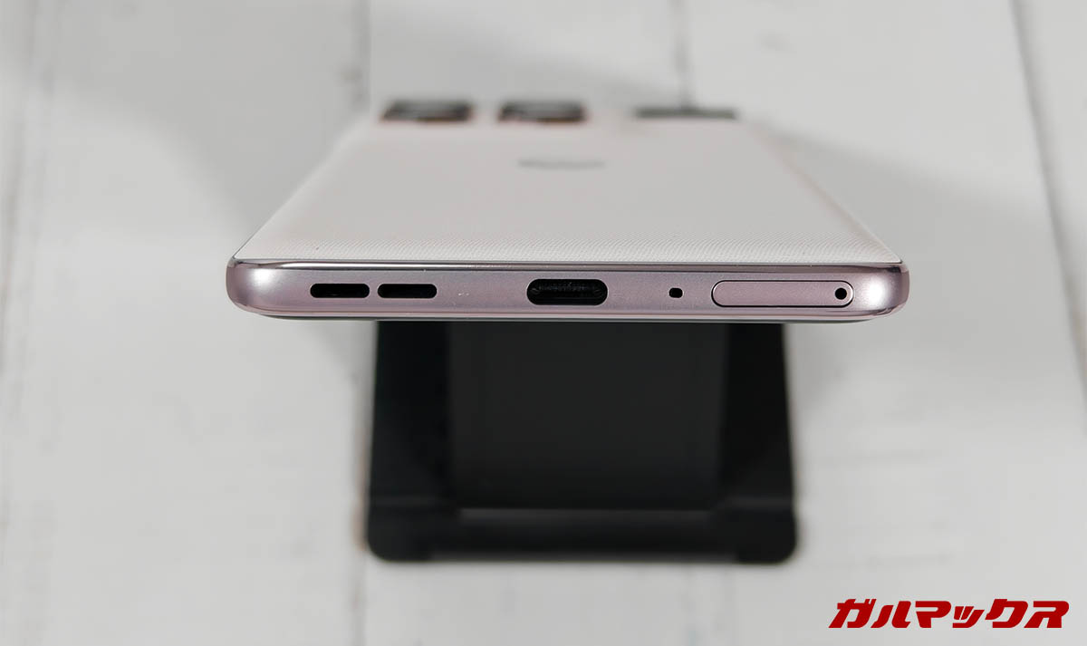 ▼横幅は73.04mmと6.7インチのスマホの中では若干細めです。この若干と側面のカーブが合わさり、握った時に指や手にスマホの角が当たらないため、かなり持ちやすいボディになっています。左側面にあるAIキーも押しやすい!↓