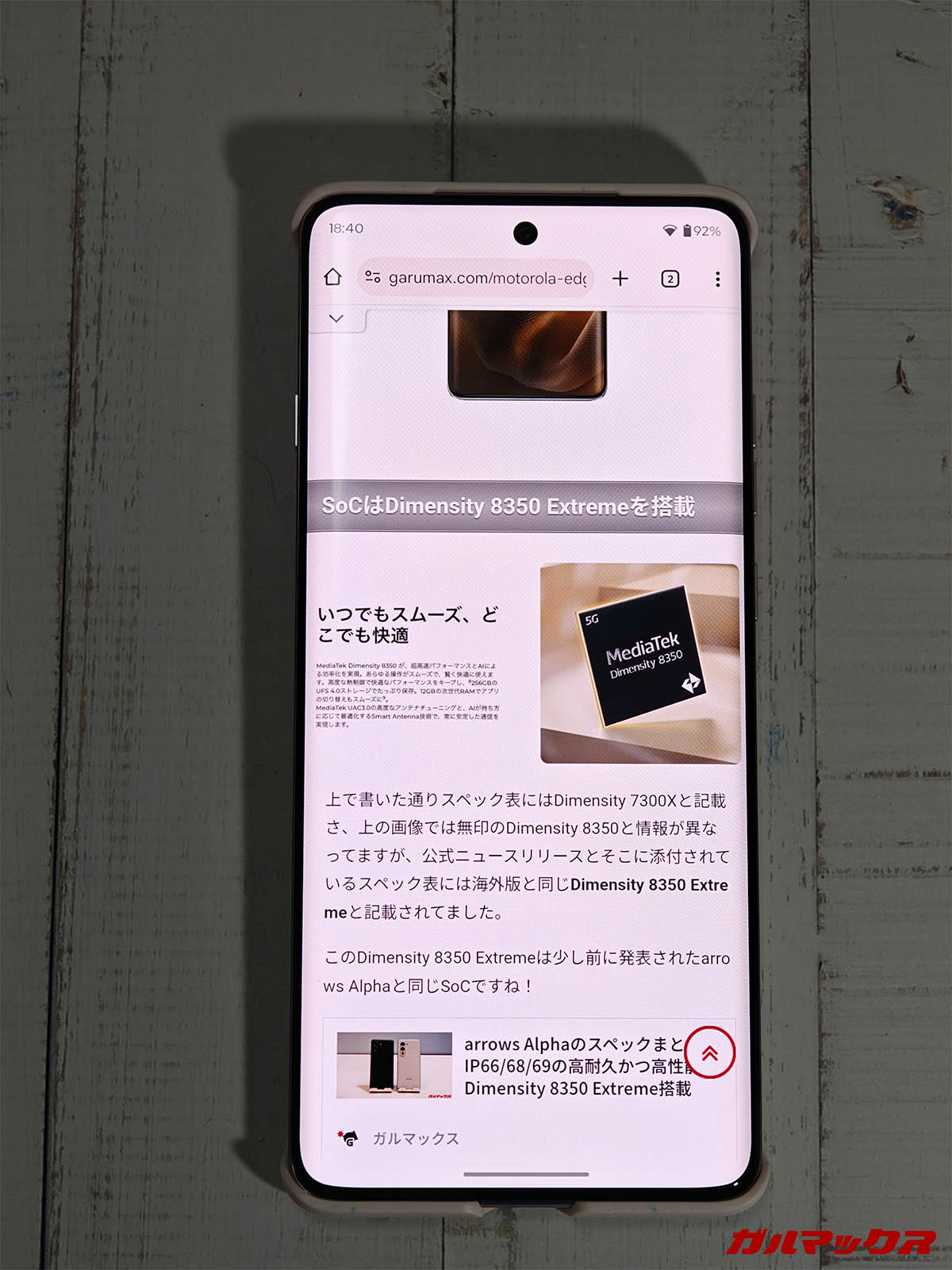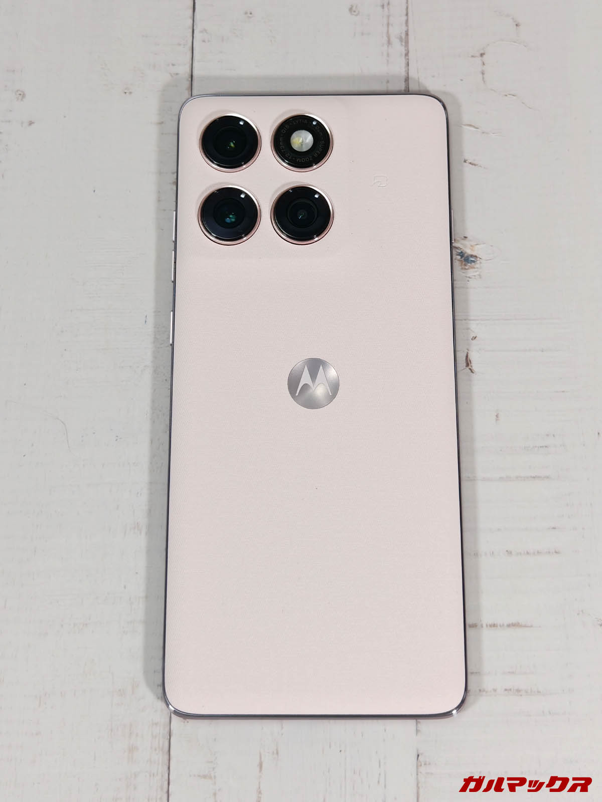 ▼レビュー機のカラーはカルサイトホワイト。Motorolaによるとこれはホワイトらしいんですが、私には薄桜色にしか見えません。そうだ、白って200色あるんだった。↓