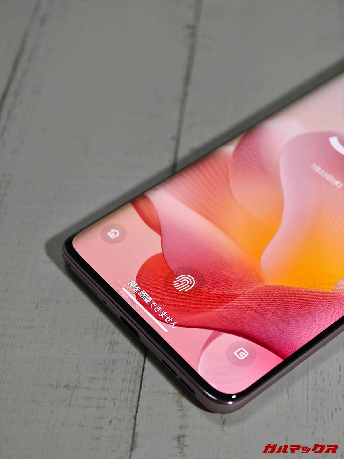 ▼画面内指紋認証は下部にある光学式のタイプ。超音波式のものには及ばないものの精度と速度はそこそこ良く不満なく使えます。位置はかなり下の方なので、持ち方によっては押しにくいかもしれません。↓