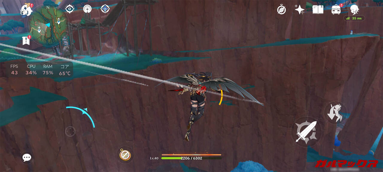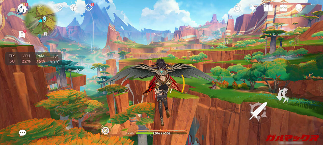 ▼原神などの重量級のゲームも5分程度であれば中~高画質で50~60FPSでのプレイが可能です。ログボやデイリー程度であれば問題なさそう。↓