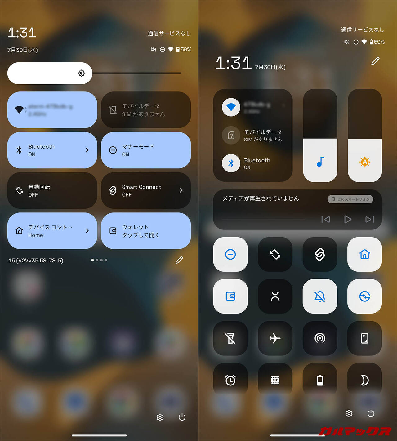 ▼コントロールセンターはAOSPのシンプルなUIと、通知とクイックセンターが分割された今風の使いやすいUIに変更可能。↓