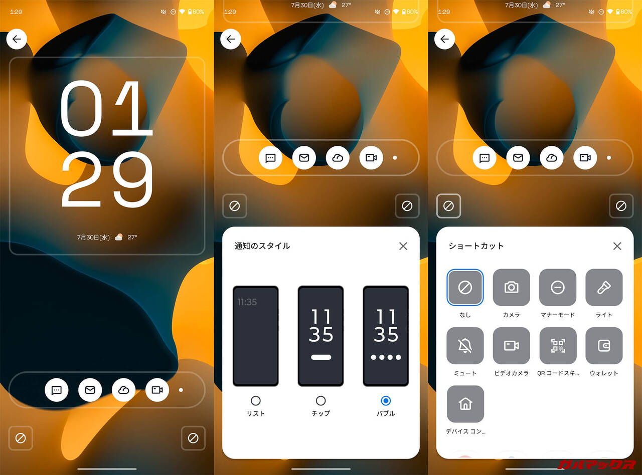 ▼ロック画面の設定。下部のショートカットにマナーモードのオンオフを配置できるのは便利!↓