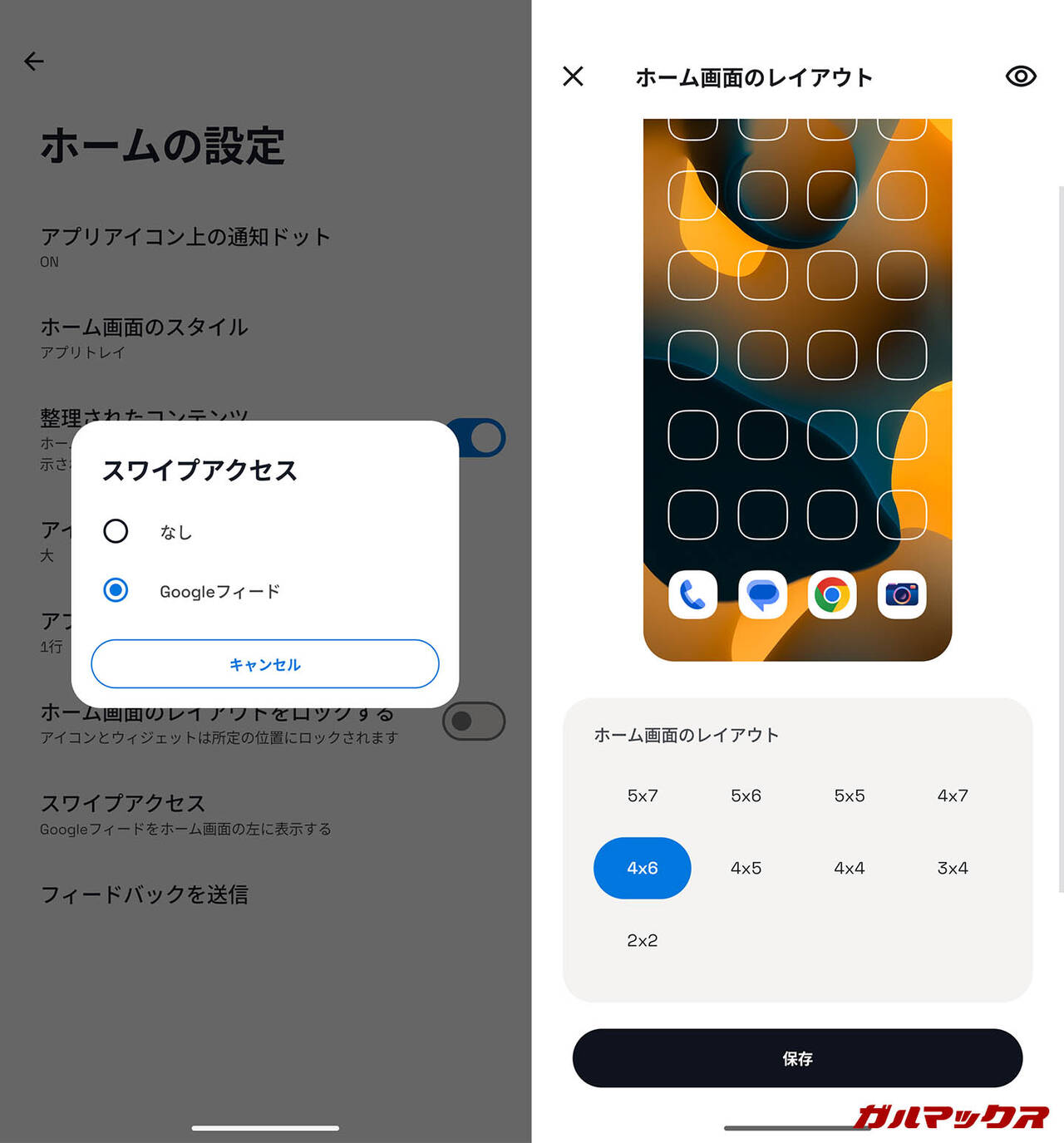 ▼左部のGoogleフィードは無効化可能。アイコンの配置数はかなり自由が利きます。大手メーカーでもデフォルトランチャーは2,3種類がいいところなので、ここまで選択肢があるのは珍しいですね。好き!!!半端な配置数しか用意していないPOCOは見習ってほしい…。↓