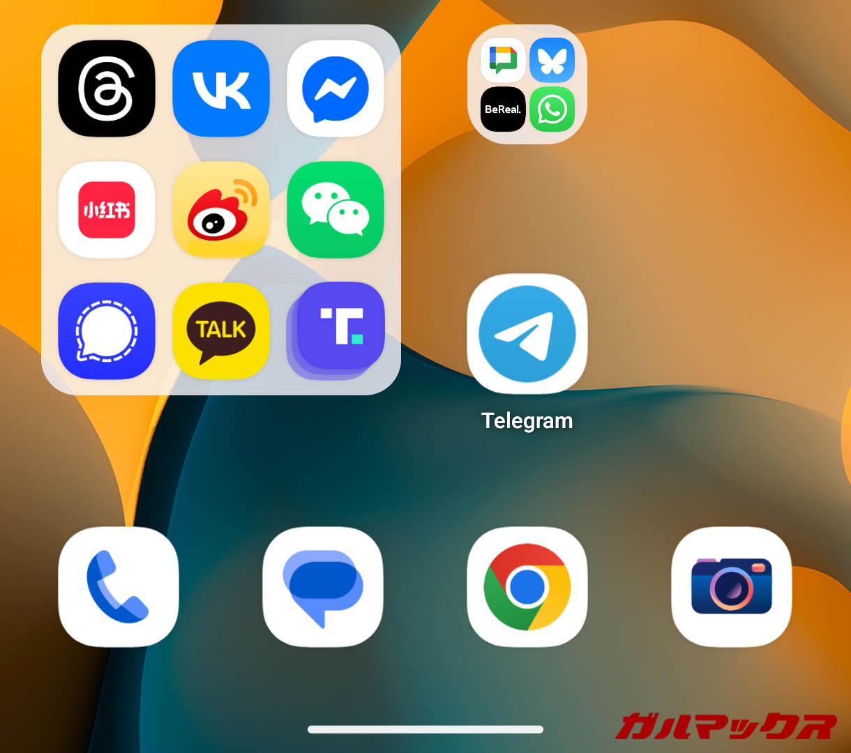 また、ピンチアウトして編集モードにするような機能が搭載されていないため、アプリをまとめて削除したりフォルダに移動したりが出来ないのはちょっと不便。でもある程度レイアウト決めちゃえば、そんな毎日こねくり回したりもしませんし全然許容範囲です。