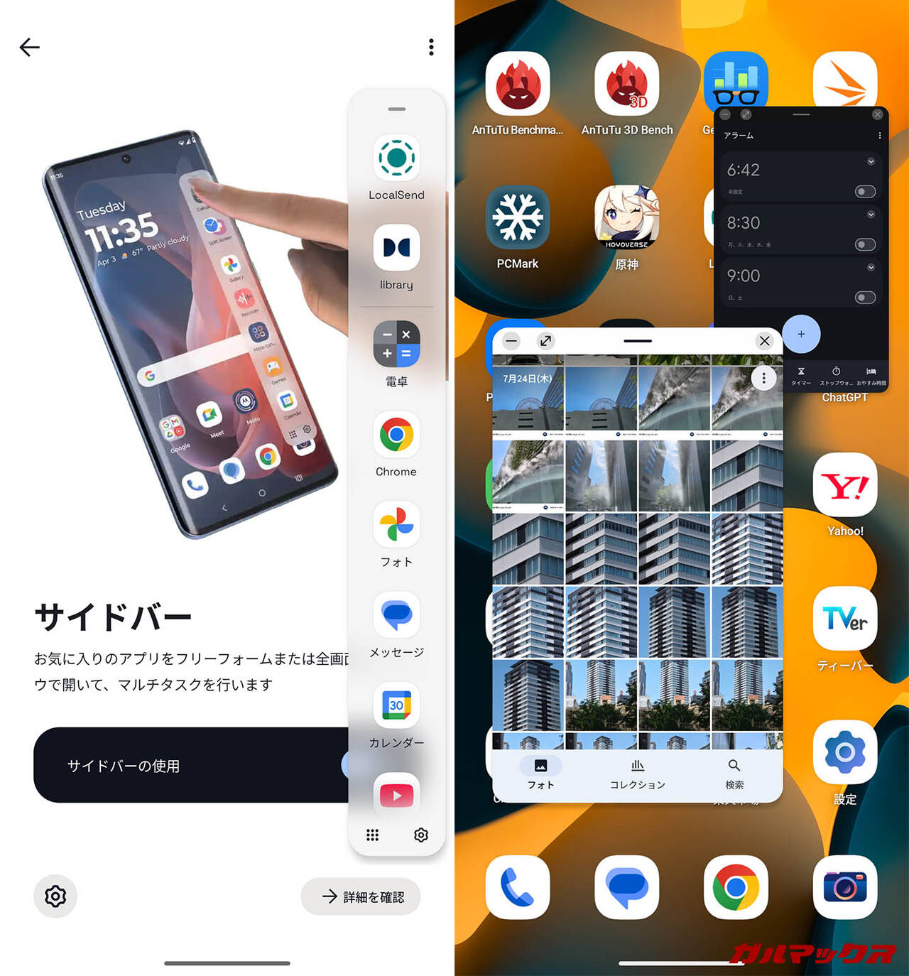 ▼本体横側から呼び出せるサイドバー。アプリ、連絡先、スクショなどの動作をフローティングウィンドウで起動することが出来ます。↓