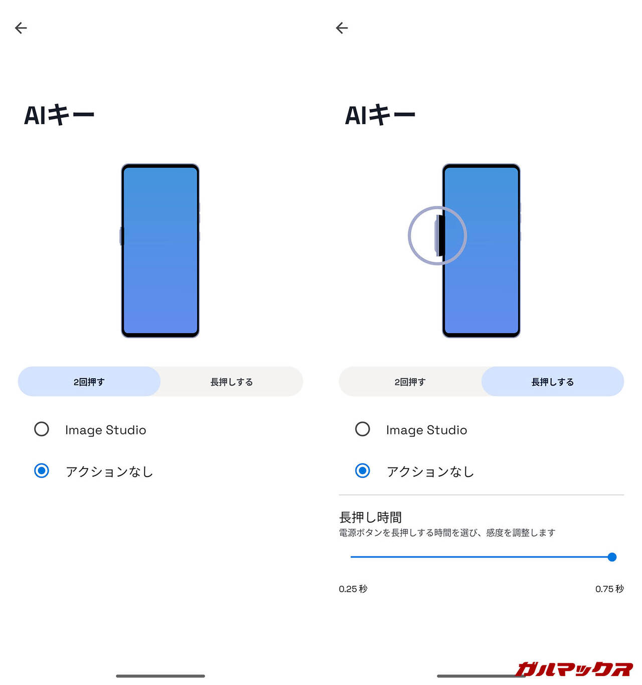 ▼本体左側面にあるAIキーを押した際の動作も変更可能。2回押しと長押しの2種類があります。長押し時間が変更可能なのは偉い!↓