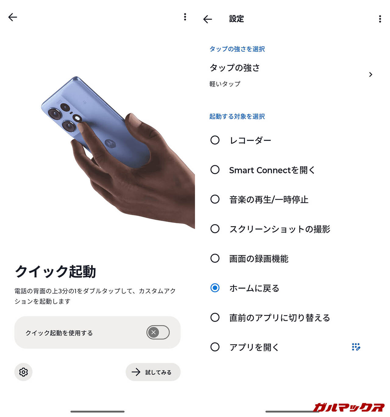 また、ジェスチャー項目に限らず各種機能の説明文が比較的丁寧です。アニメーションでの説明があったり、チュートリアルが用意されていたりとスマホ初心者でもわかりやすいような工夫がされていて非常に好感が持てます。