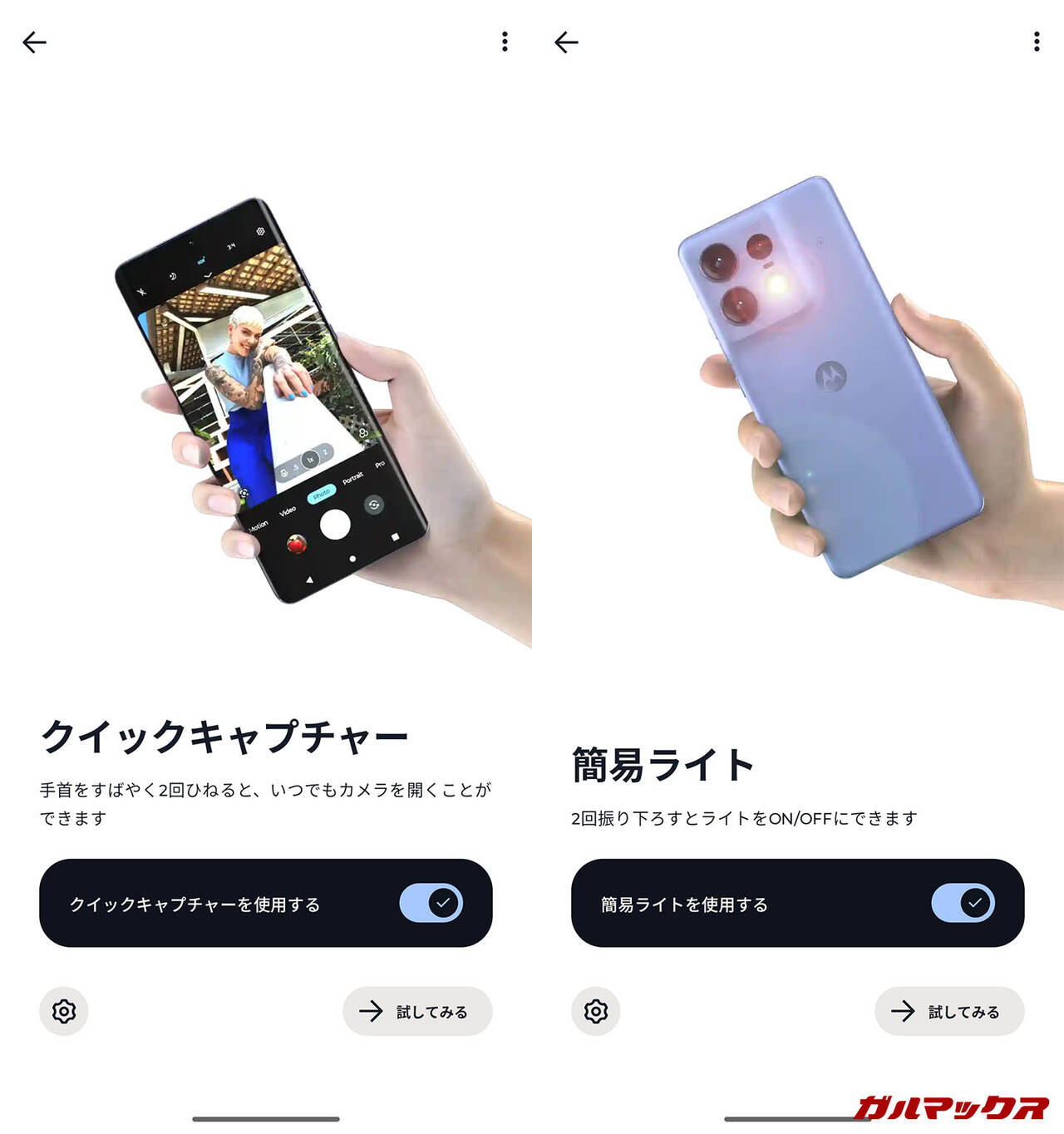 ▼他にもカメラを起動したり、懐中電灯を起動したりするジェスチャー機能も搭載。カメラは電源ボタンの2度押しでも起動できるので好きな方を選びましょう。あ、懐中電灯はカメラのフラッシュと同じなので黄色い光です。マジなんでなん。↓