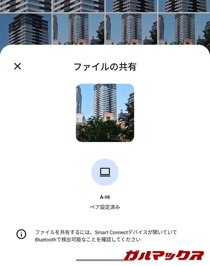 ▼また、接続中はスマホの各アプリの共有ボタンを押すとQuickShareとは別に、AirDropのようにPCにファイルを送信できるようになります。↓