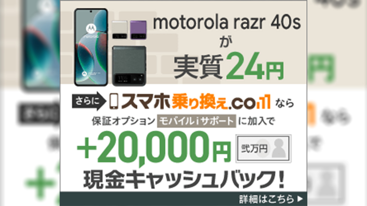 ソフトバンク正規代理店のスマホ乗り換え.comにて「motorola razr 40s」がお得になってますよ!2年レンタル時の負担金は24円、しかも2万円のキャッシュバック付き。