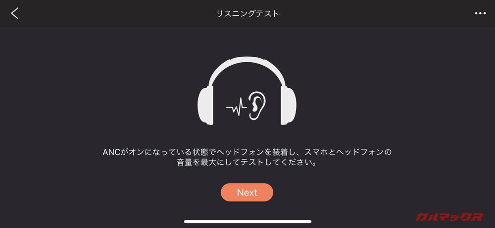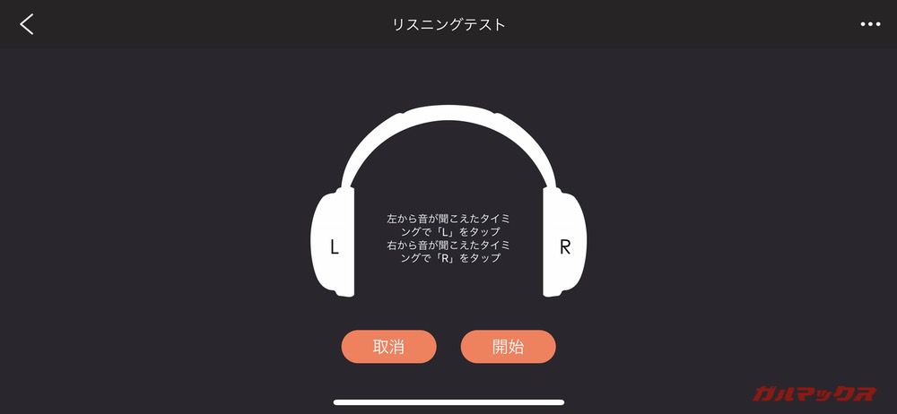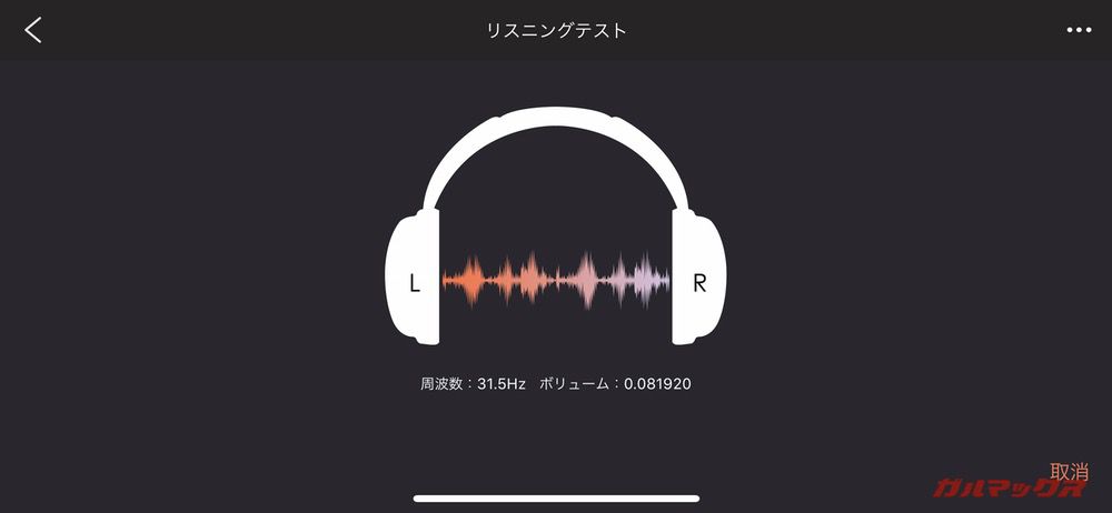 ▼テストは聴力検査のようで、各周波数の音を発し聞こえた側(L/R)のアイコンをタップすることで検査を進めます。最大音量状態でテストを行う必要があるので音量設定忘れに注意l↓